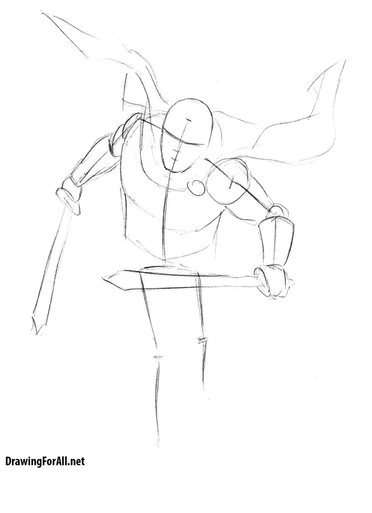 Finally, you should draw the contours of the mantle and swords. Please note that the blade near the hilt is narrow, but wide tip.